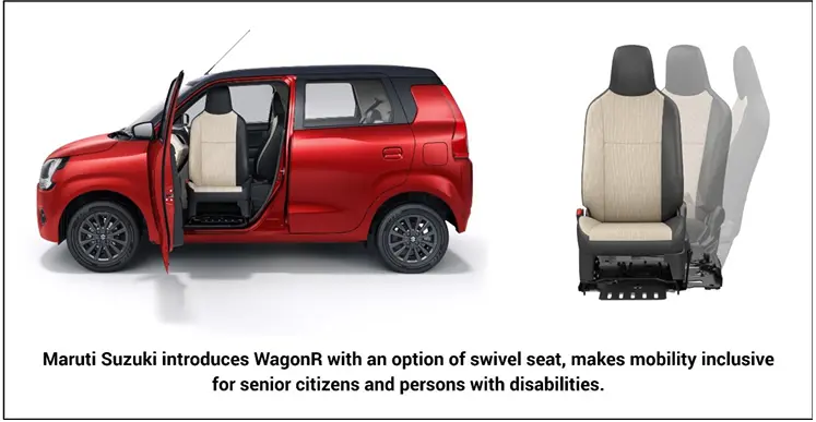 For this initiative, Maruti Suzuki has teamed up with Bangalore-based startup TRUEAssist Technology Private Limited under its startup Incubation Program with NSRCEL-IIM Bangalore.# Customers can order swivel seat as a retro fitment kit at Maruti Suzuki Arena dealerships. The seat can be installed in new WagonR models or retrofitted in existing vehicles*. With this initiative, the Company intends to bring ease of accessibility across a wide customer base.